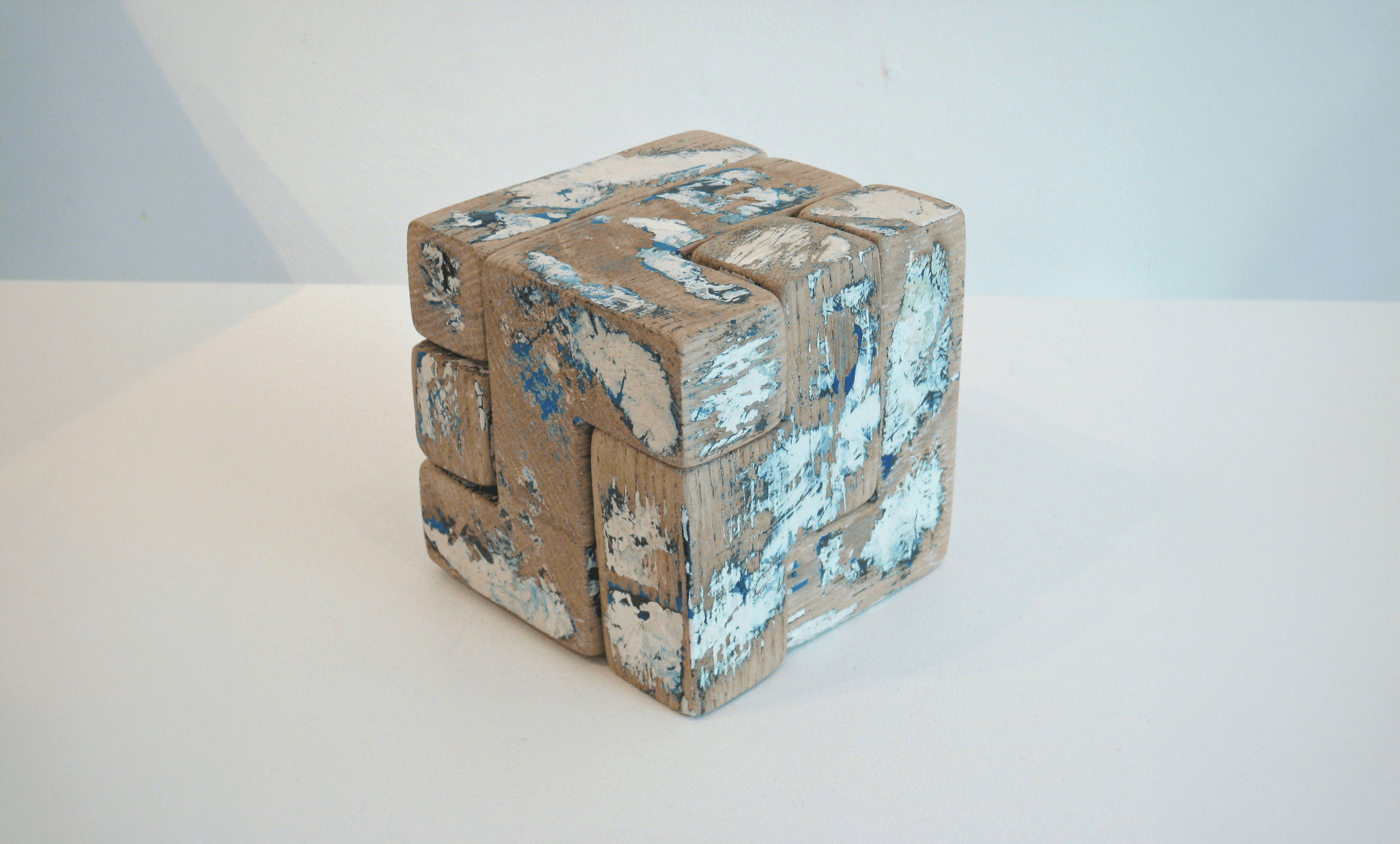 Irregular fragments that assemble into a perfect cube, their forms shaped by a quiet, language-like structure of interlocking relationships.